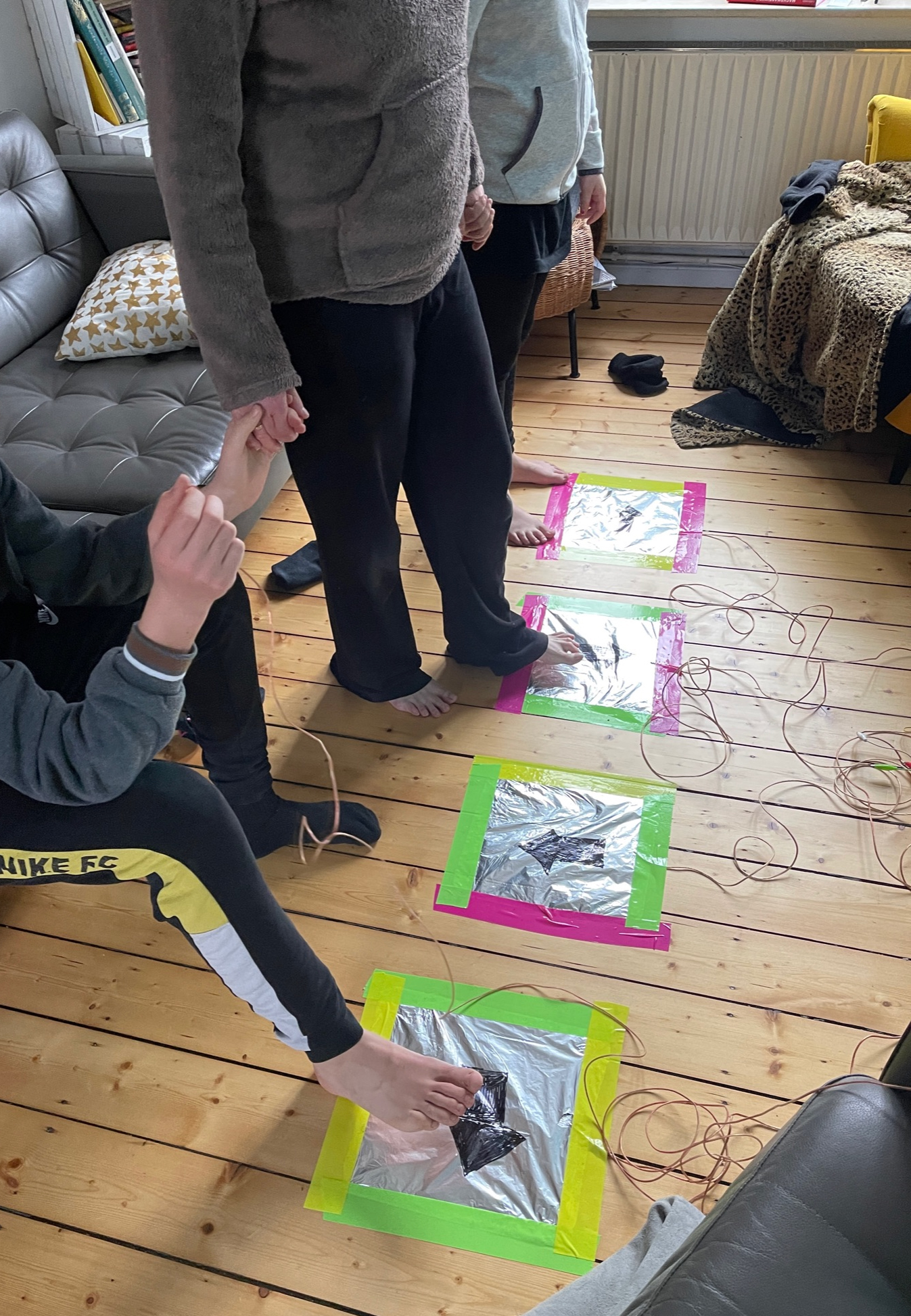 Wir haben jetzt schon 3 Projekte umgesetzt: den Mehrspieler-Controller, mit dem wir auf der Leinwand im Wohnzimmer das vorgeschlagene Jump 'n' Run gespielt haben, das Stapelspiel, das wir bald mit Make 'n' Break-Steinen und -karten gepimpt haben, und das Bodenklavier, das wir allerdings auch mit anderen Tönen bestückt haben. Alle Projekte stammen aus dem PDF der Pädagogischen Hochschule Schwyz.